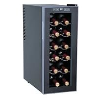 Designed to fit into more places, this slim wine cooler keeps up to 12 standard-size bottles of wine properly chilled and ready to enjoy. Its touch-sensitive control panel with an LED temperature display makes it simple to adjust the thermostat between 52 and 65 degrees F, depending on the type of wine stored. The unit accommodates full reds at temperatures from 59 to 65 degrees F, light reds at 54 to 57 degrees F, and rose and white wines at 52 to 57 degrees F. Since it only chills to 52 degrees F, however, it's not recommended for sparkling wine or champagne, which taste best when chilled at cooler temperatures. The cooler supplies five slide-out chrome shelves with a scalloped design for securely cradling the bottles of wine. Furthermore, the unit features a thermoelectric cooling system, which avoids vibrations caused by compressor cooling systems. Such vibrations disturb the sediments in wine, disrupting the aging process. Without vibration, stored wine can age naturally. Even more, the unit's environmentally friendly thermoelectric cooling system uses no Freon, which can be harmful to the planet; offers energy efficiency, only using about as much energy as a 75-watt light bulb; and delivers ultra-quiet operation. Other thoughtful details include soft interior lighting with an on/off switch, adjustable leveling legs, and a tinted double-pane glass door with a recessed handle for a clean look. Freestanding and ETL-approved, the 70-watt wine cooler measures 19-1/2 by 10-1/4 by 25-3/5 inches and carries a one-year limited warranty.